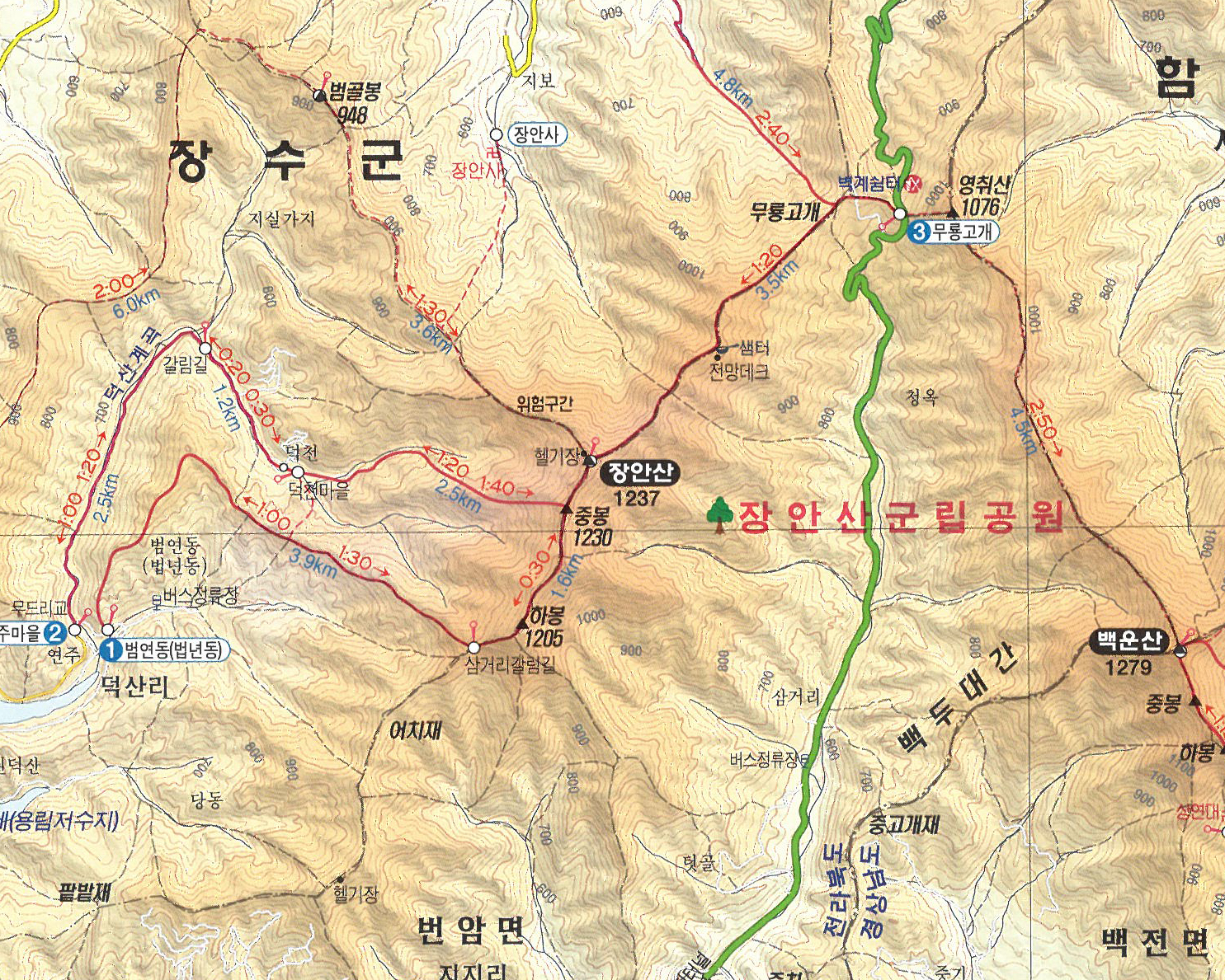 무룡고개 주차장 – 등산로입구 – 억새밭 – 장안산정상(1230m) - 원점회귀 (6.4km, 정상까지 1시간15분, 정상에서 날머리까지 55분)