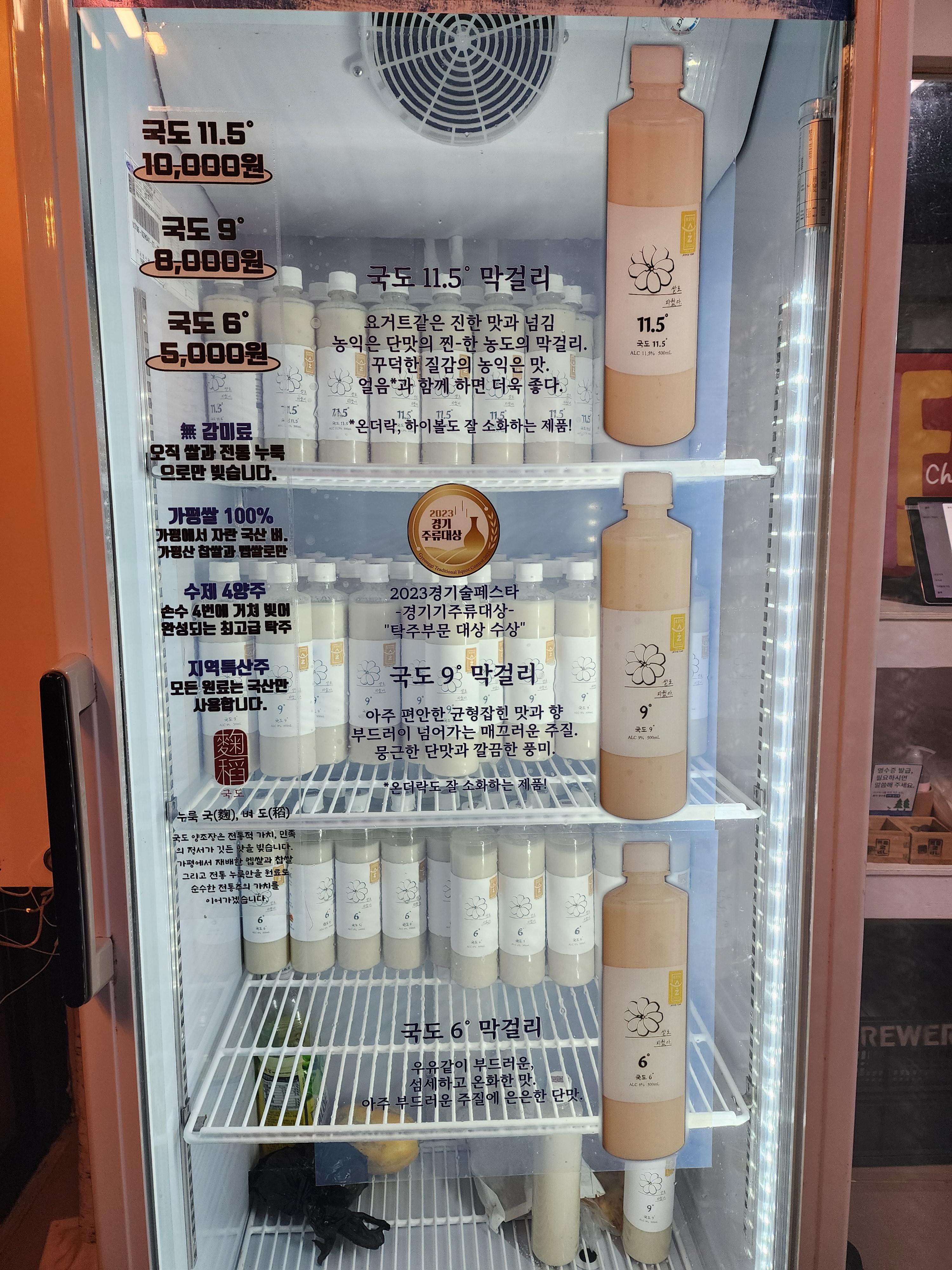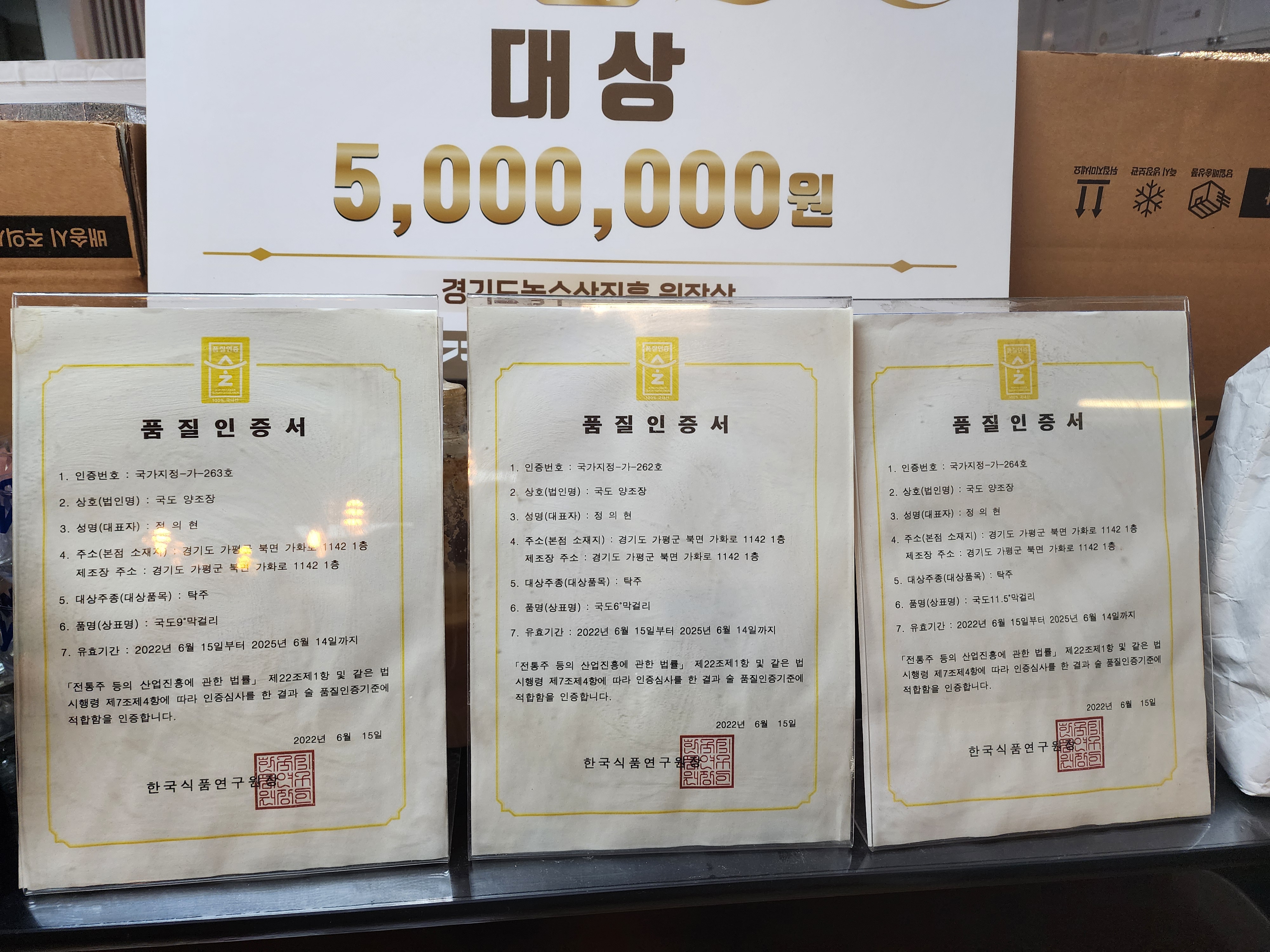 국도양조장은 농촌진흥청 출신 대표가 빚는데, 경기전통주 품평에서 대상을 받을 정도로 술이 좋습니다. 6도, 9도, 11.5도 세 종류를 판매하고 있는데, 바디감이 굉장히 좋은 술이라 청량감을 좋아하는 분들은 싫어할 수도 있습니다.