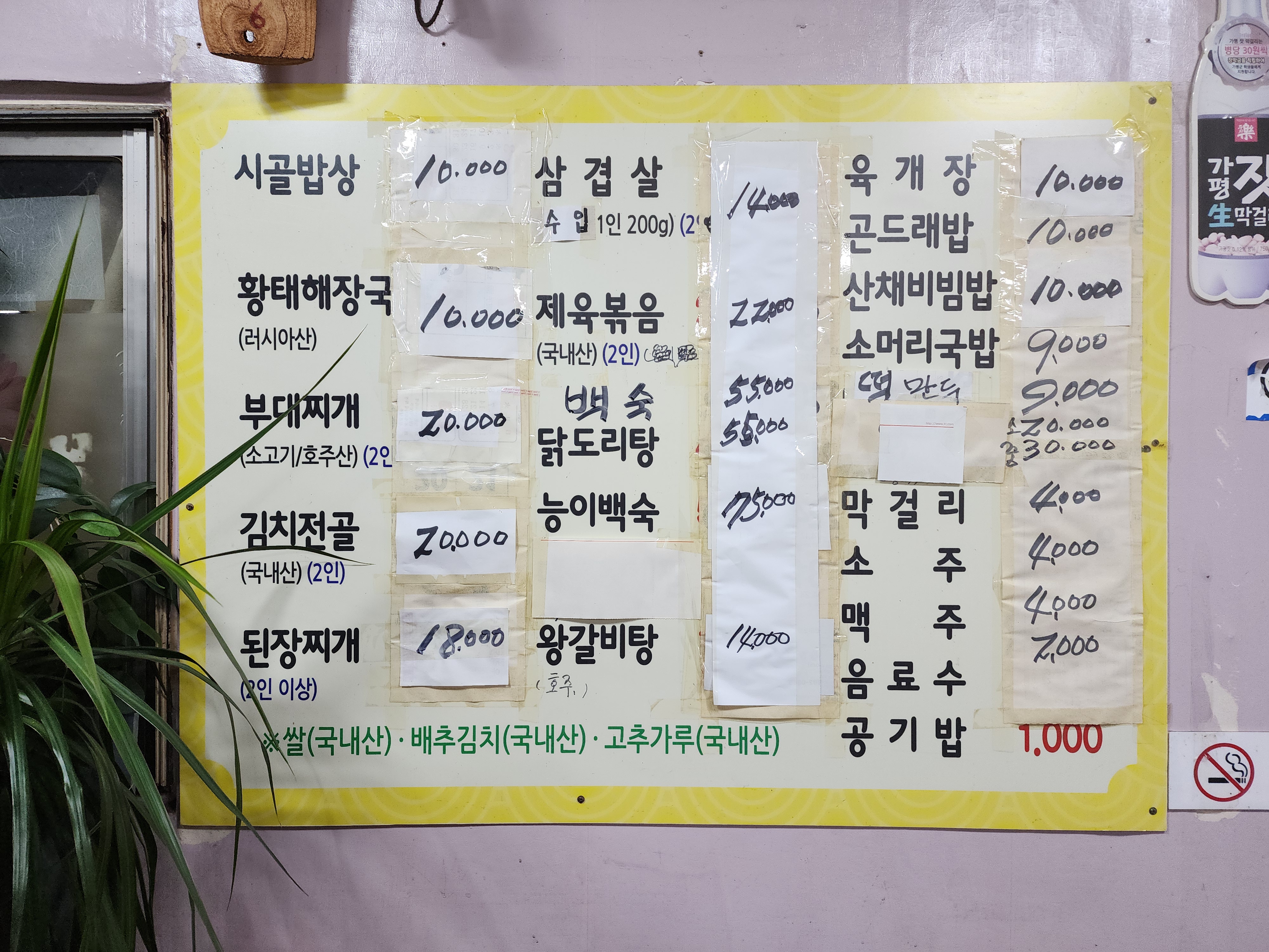 국도양조장에서 북면 목동리쪽으로 내려와 식당을 찾다가 들어간 [시골밥상]은 대만족입니다. 삼척출신 76세(49년생,소띠)사장님이 9년 전 동생의 권유로 이곳으로 와서 식당을 열었는데, 삼척에서도 식당업을 해 와서인지 음식 솜씨가 좋고 인심도 좋네요.