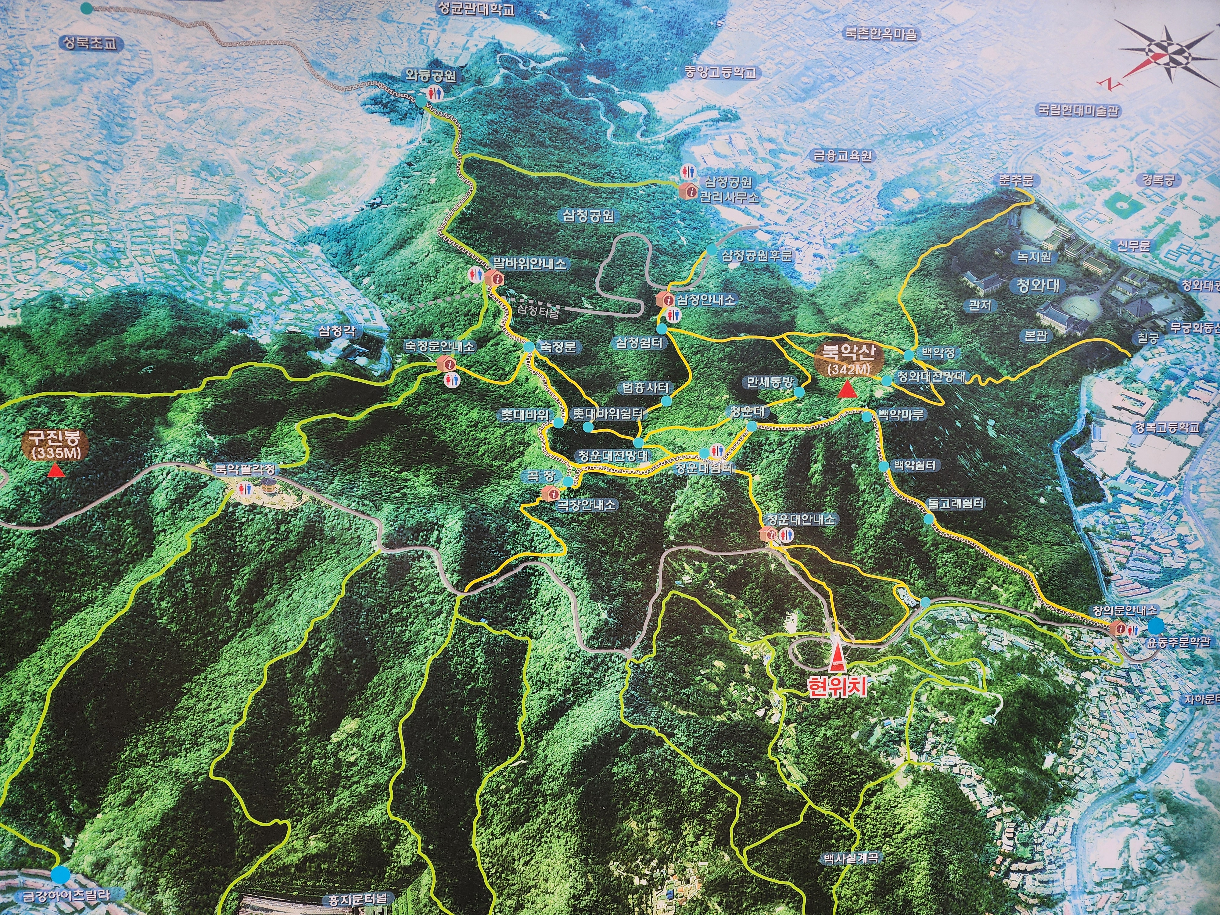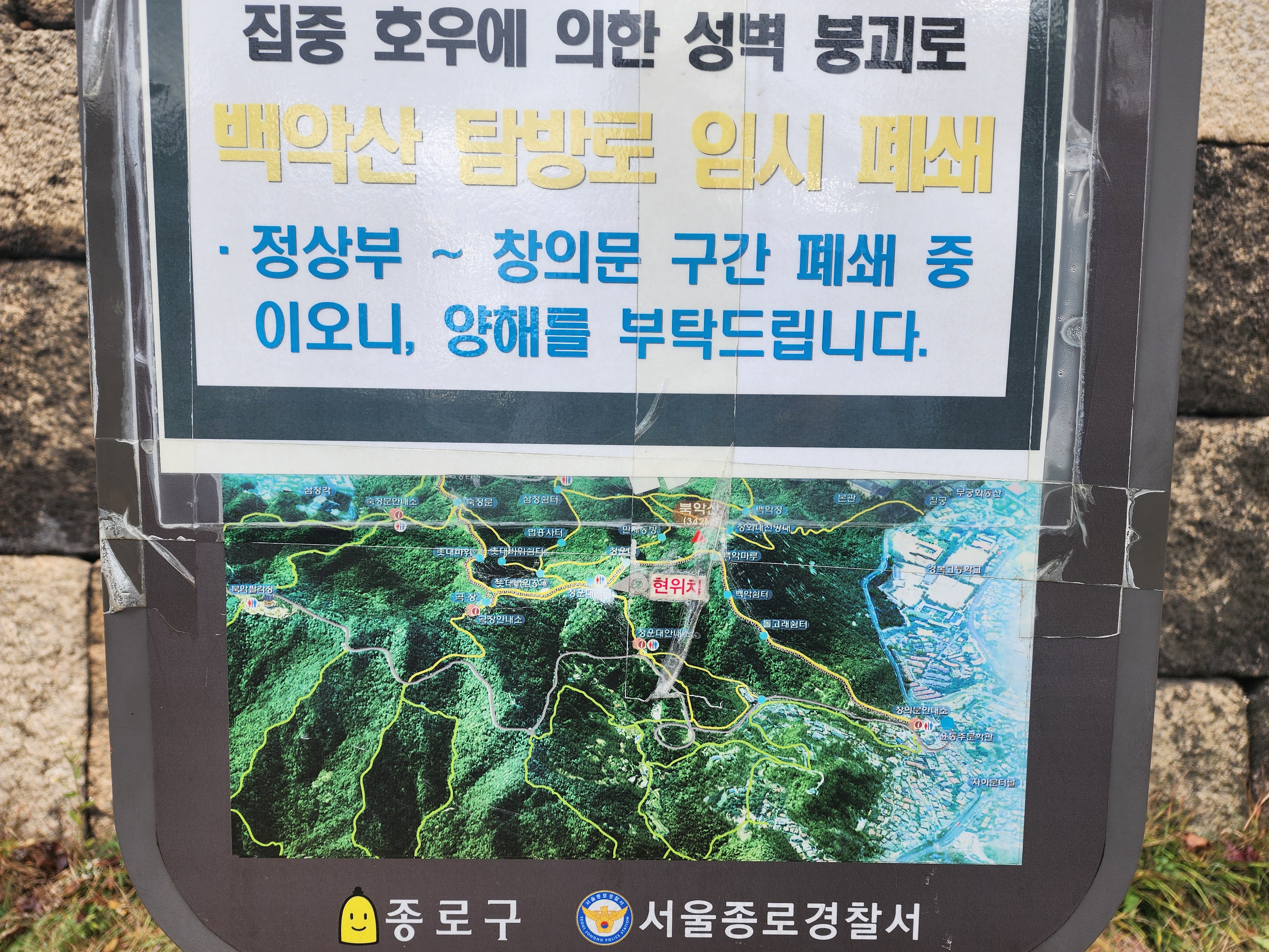 지금까진 경복궁역에서 출발해 인왕산을 타고 윤동주 문학관으로 내려와 건너편 창의문에서 북악산 정상을 지나 삼청공원으로 내려오면 쉬는 시간 포함 3시간 정도 걸리는데, 당분간 창의문에서 북악산 코스를 오를 수 없으니 한동안은 안 갈 것 같네요.