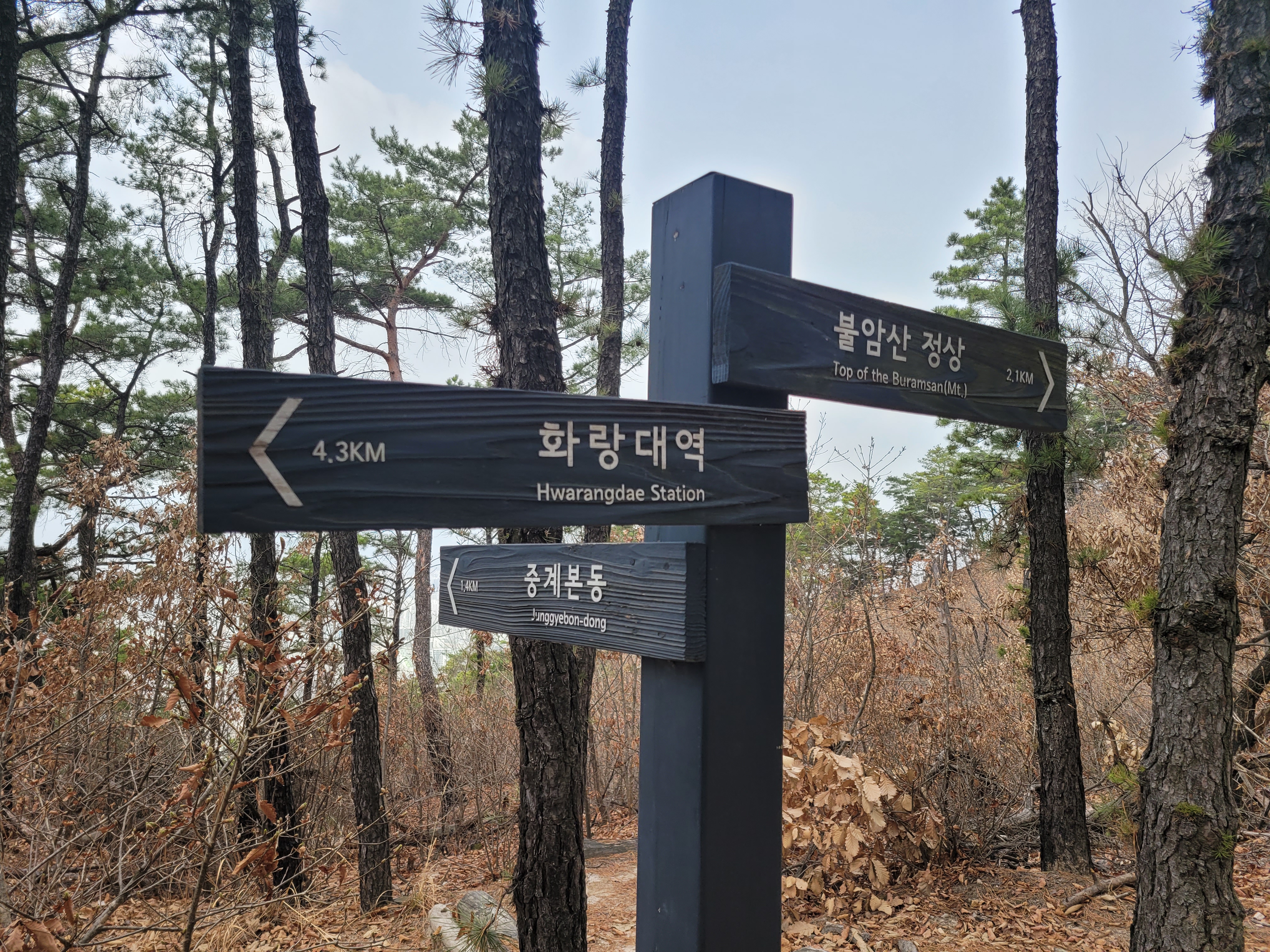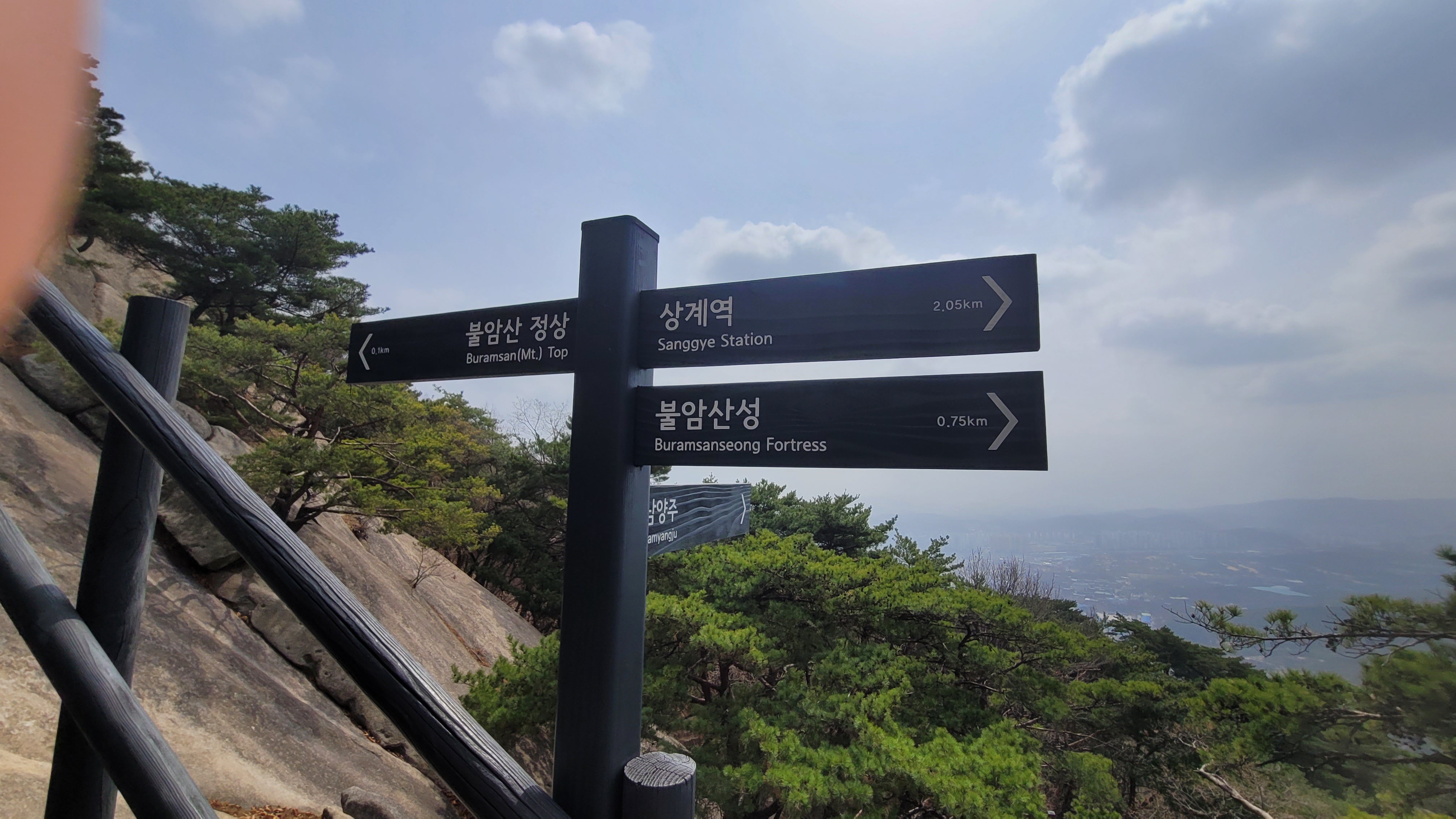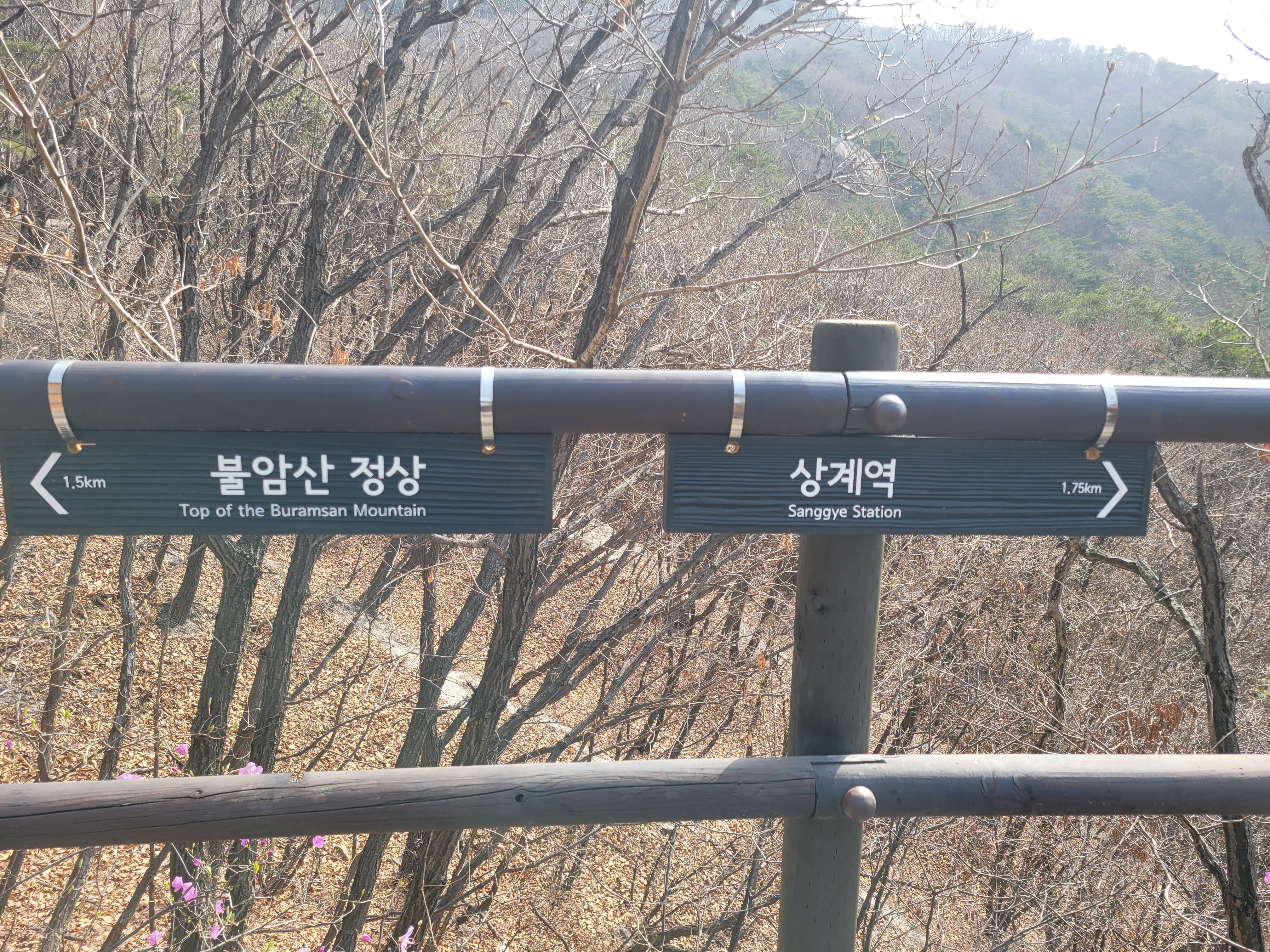 국기봉이 있는 정상(508m)에는 사람들이 많아 인증샷 찍는데도 시간이 걸리네요. 깔딱고개를 지나 불암산성으로 이어진 능선길은 누구나 편하게 다닐 수 있는 평지의 숲길이라 또다른 매력이 있네요. 별내쪽으로 내려가야 있는 불암사는 이번에는 패스하고 화랑대역 이정표를 따라 계속해서 능선을 타고 내려옵니다.