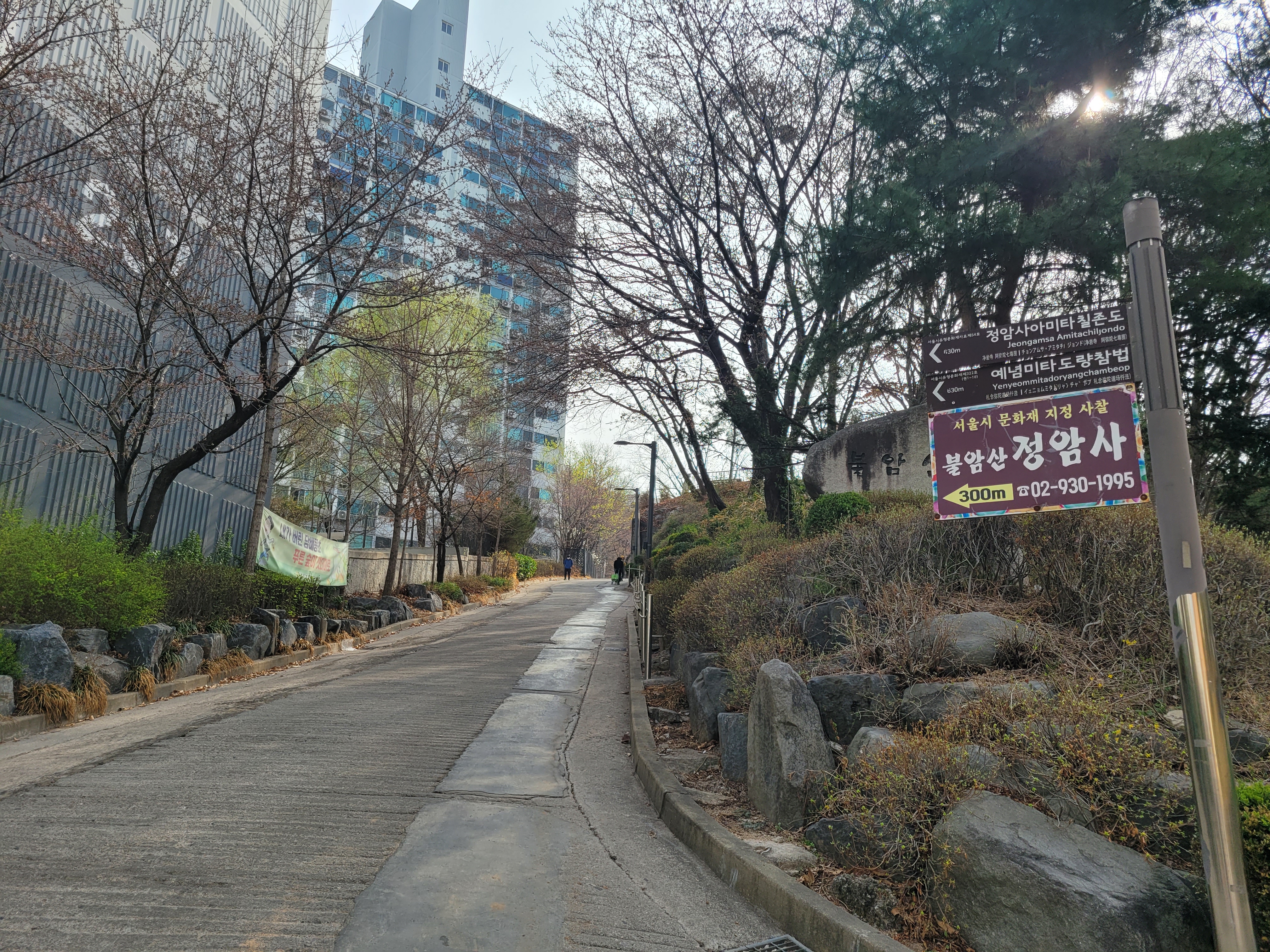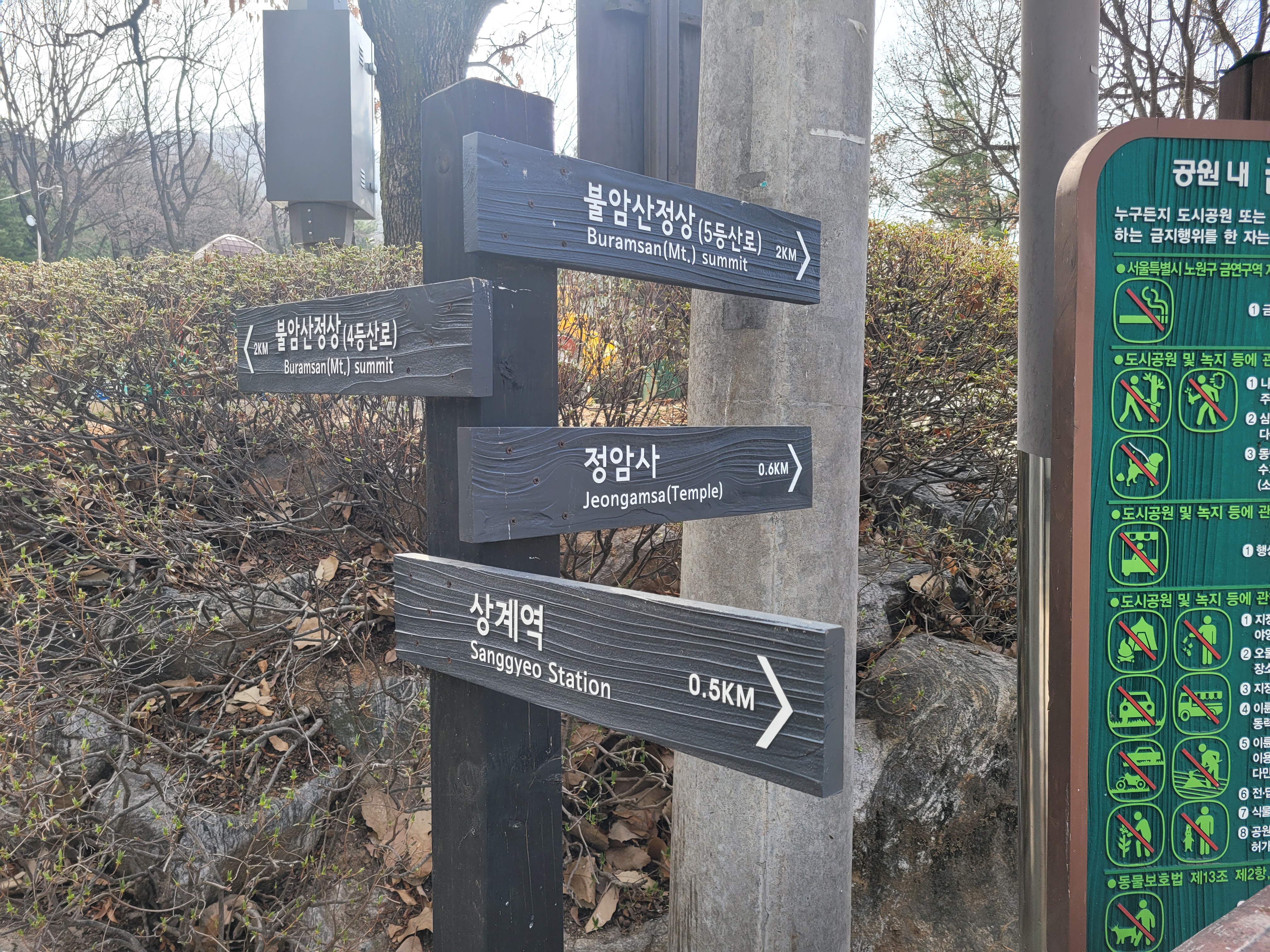 상계역에서 400m쯤 걸어서 불암산공원 입구에 도착, 정암사로 해서 정상가는 5등산로 코스는 2km, 불암정으로 해서 정상을 가는 4등산로 코스는 2.4km.