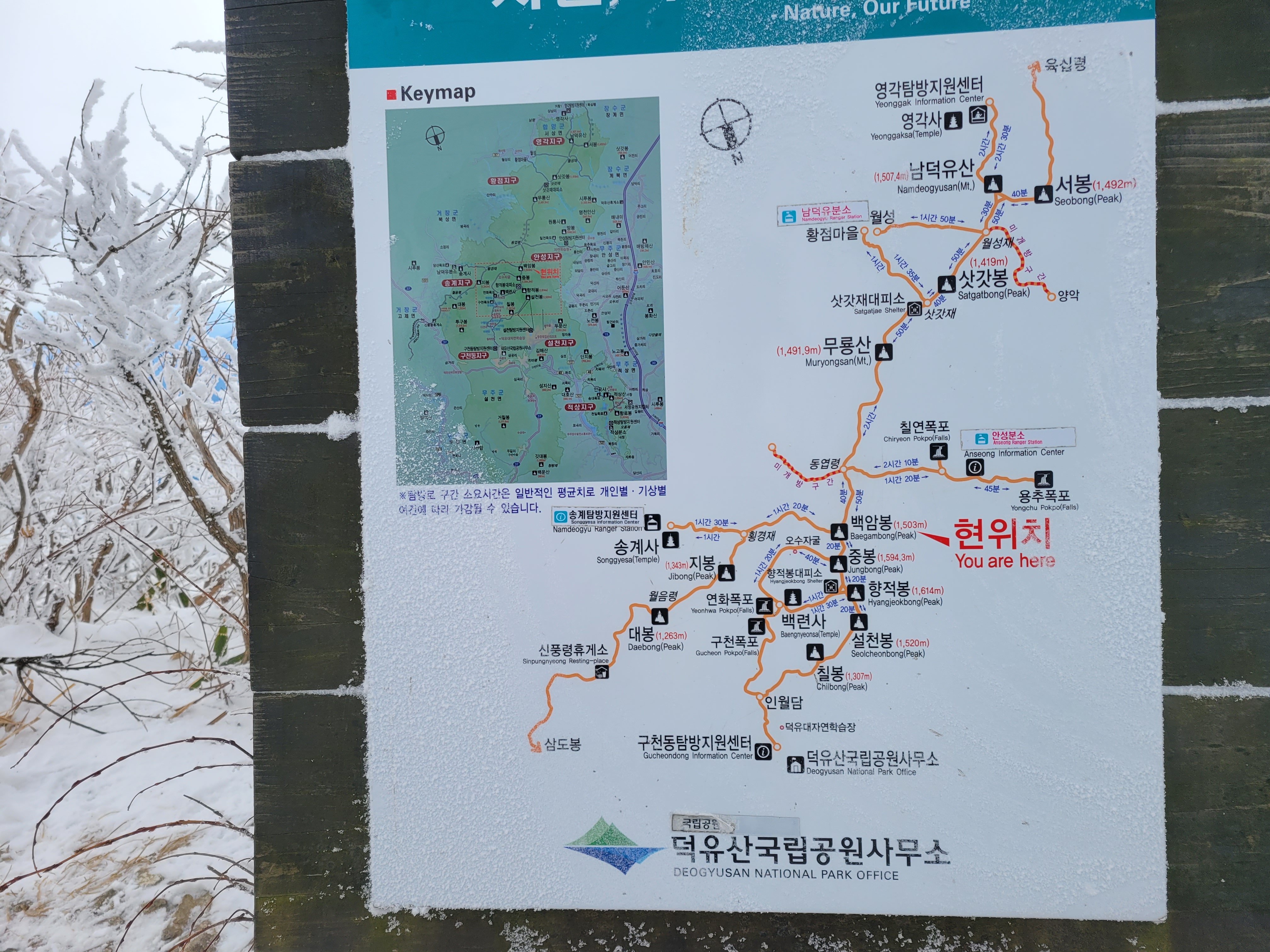 안성탐방지원센터-칠연폭포갈림길-동엽령-백암봉-중봉-향적봉대피소-향적봉(1,614m)-백련사-덕유산국립공원 탐방안내소-삼공주차장(약 17.4km/6시간 20분)