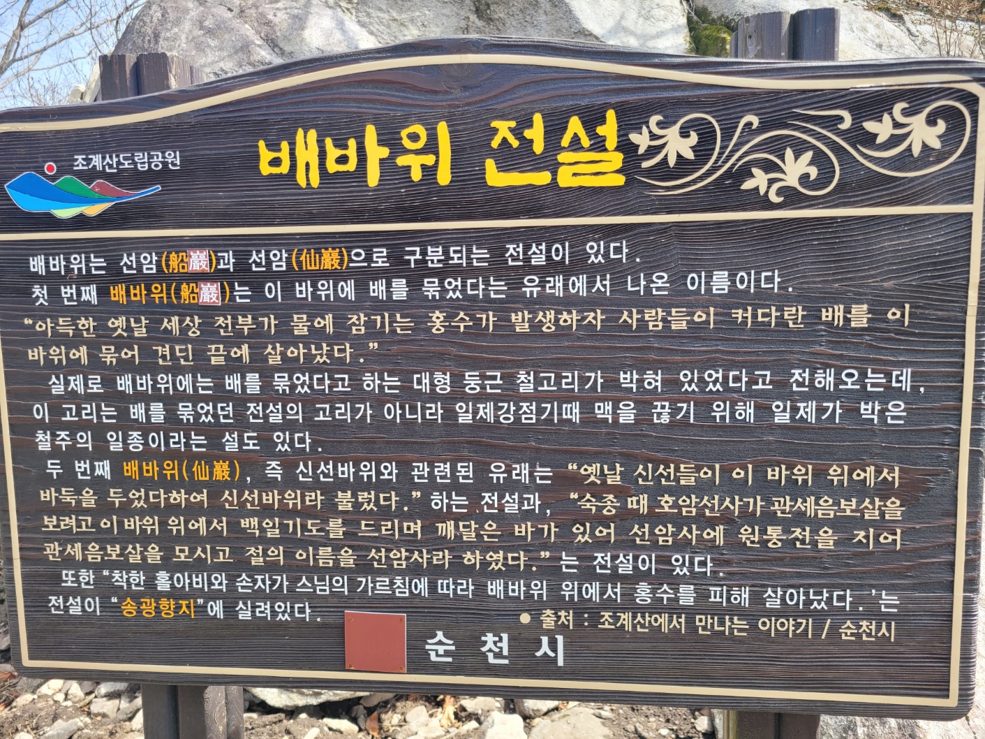 降仙樓 편액, 누가 썼는지는 낙관이 너무 작고 획도 떨어져나간 듯 하여 읽을 수가 없다.先覺堂 편액좌측 대각암으로 가기 전 우측 선암사로 올라가 경내를 구경하고 위쪽에서 대각암 방향으로 올라가는 길이 또 나온다.조계산선암사(曹溪山仙巖寺) 글씨는 조선중기 석봉 한호(石峯 韓濩, 1543-1605)의 글씨로 석봉선생의 지금 보이는 大字글씨는 14세기 원나라 승려 설암(雪菴)의 글씨를 그대로 따르고 있다.太古叢林曹溪山仙巖寺(태고총림조계산선암사) 편액 글씨는 여수 출신 서예가이자 호남대학교 교수를 역임한 목인 전종주(木人 全鍾柱, 1951~ )선생의 글씨.六朝古寺 편액만세루대웅전