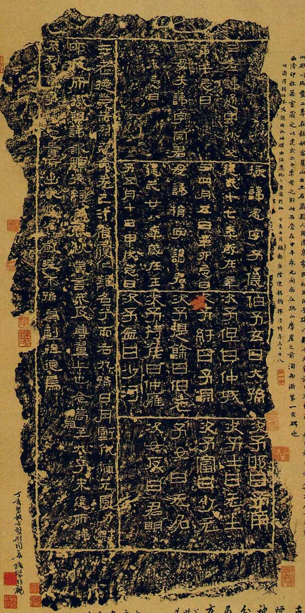 汉三老碑,全称“汉三老讳字忌日记刻石”,约刻成于东汉建武二十八年,即公元52年。清咸丰二年(1852),出土于浙江余姚客星山下,为近村严陵坞周世熊所得。清咸丰十一年(1861),太平天国军攻陷余姚,此碑被义军扑地起灶,幸碑文未受到大的损伤。1921年,此碑辗转至上海,沪上外商闻之欲出重金收购,事 为浙江同乡沈宝昌、姚配石获悉,后经西泠社社首任社长吴昌硕等积极呼吁,同乡募捐集8000金购得此碑,并在西泠印社筑石室永久保存。