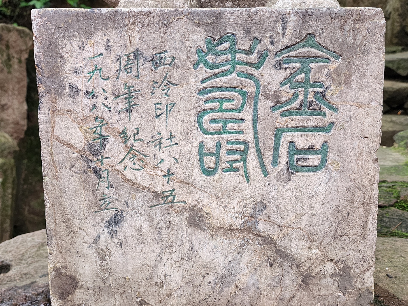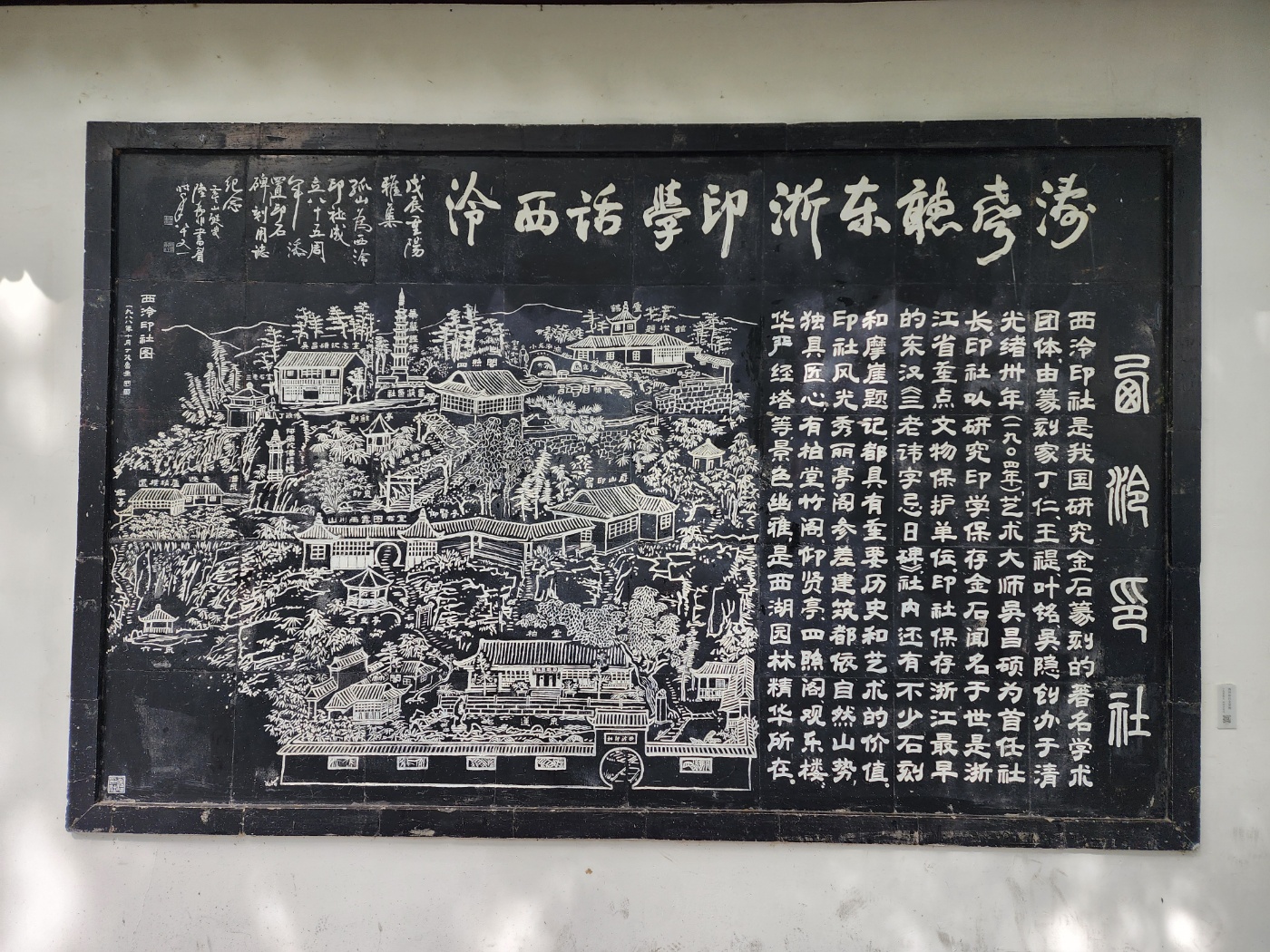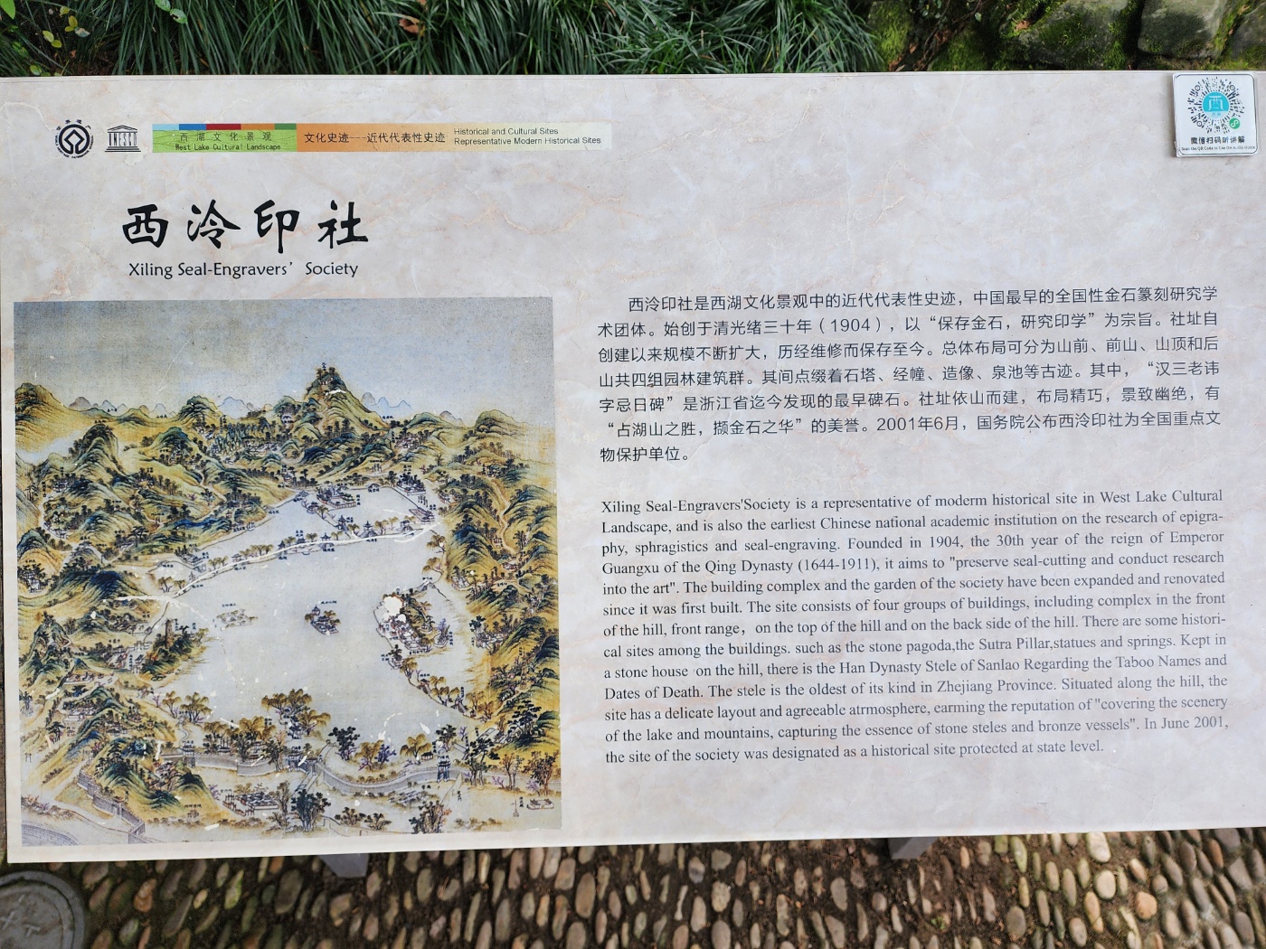 西泠印社是西湖文化景观中的近代代表性史迹,中国最早的全国性金石篆刻研究学術團體. 始创于清光绪三十年(1904),以“保存金石,研究印学”为宗旨。社址自创建以来规模不断扩大,历经维修而保存至今。总体布局可分为山前、前山、山顶和后 山共四组园林建筑群。其间点缀着石塔、经幢、造像、泉池等古迹。其中,“汉三老讳字忌日碑”是浙江省迄今发现的最早碑石。社址依山而建,布局精巧,景致幽绝,有“占湖山之胜,撷金石之华”的美誉。2001年6月,国务院公布西泠印社为全国重点文 物保护单位。