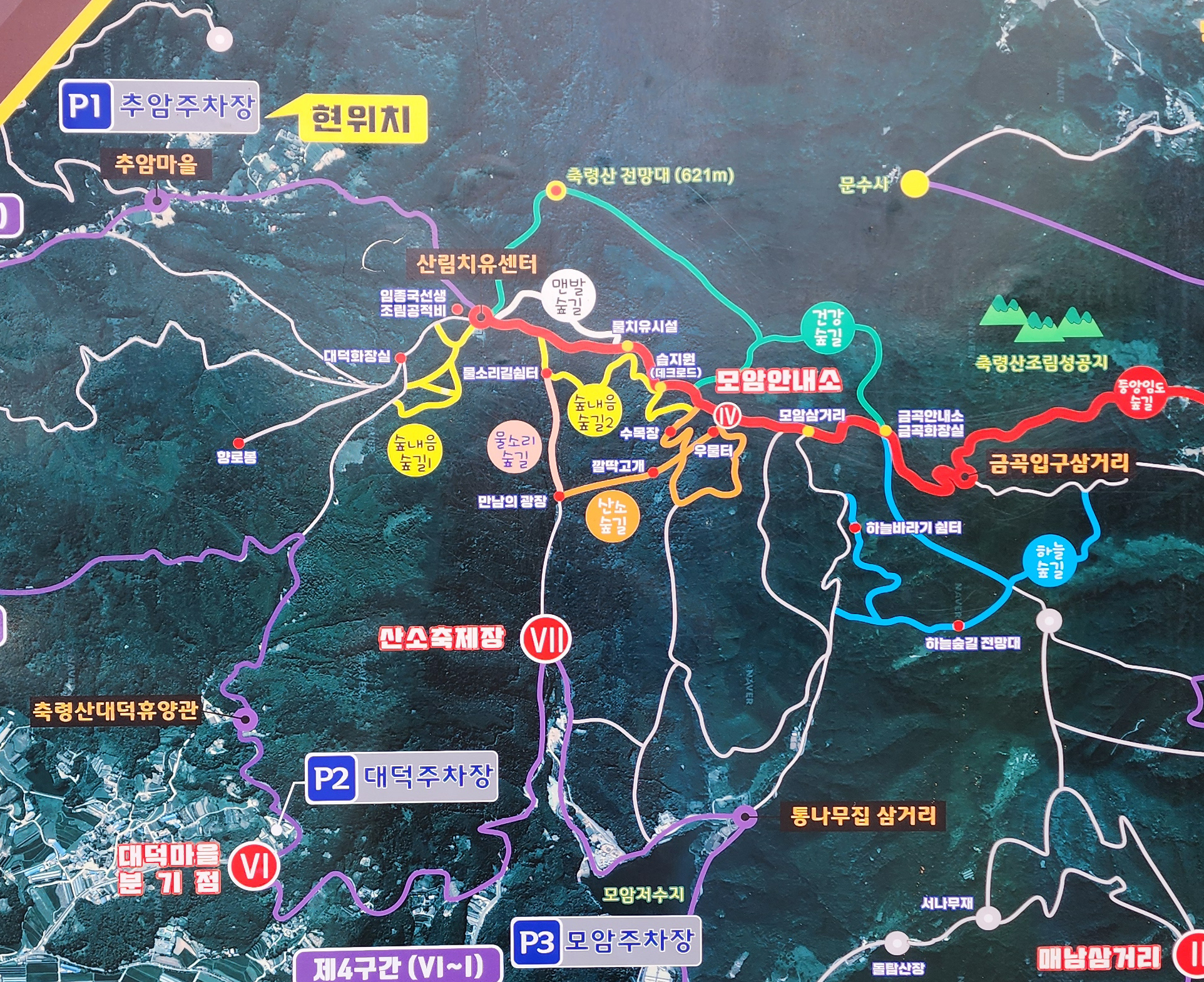 금곡영화마을 – 건강숲길 – 축령산정상 – 임종국조림공적비 – 물소리길 – 만남의광장 – 깔딱고개 – 우물터 – 모암삼거리 – 금곡영화마을 (10.1㎞ / 약 4시간30분)