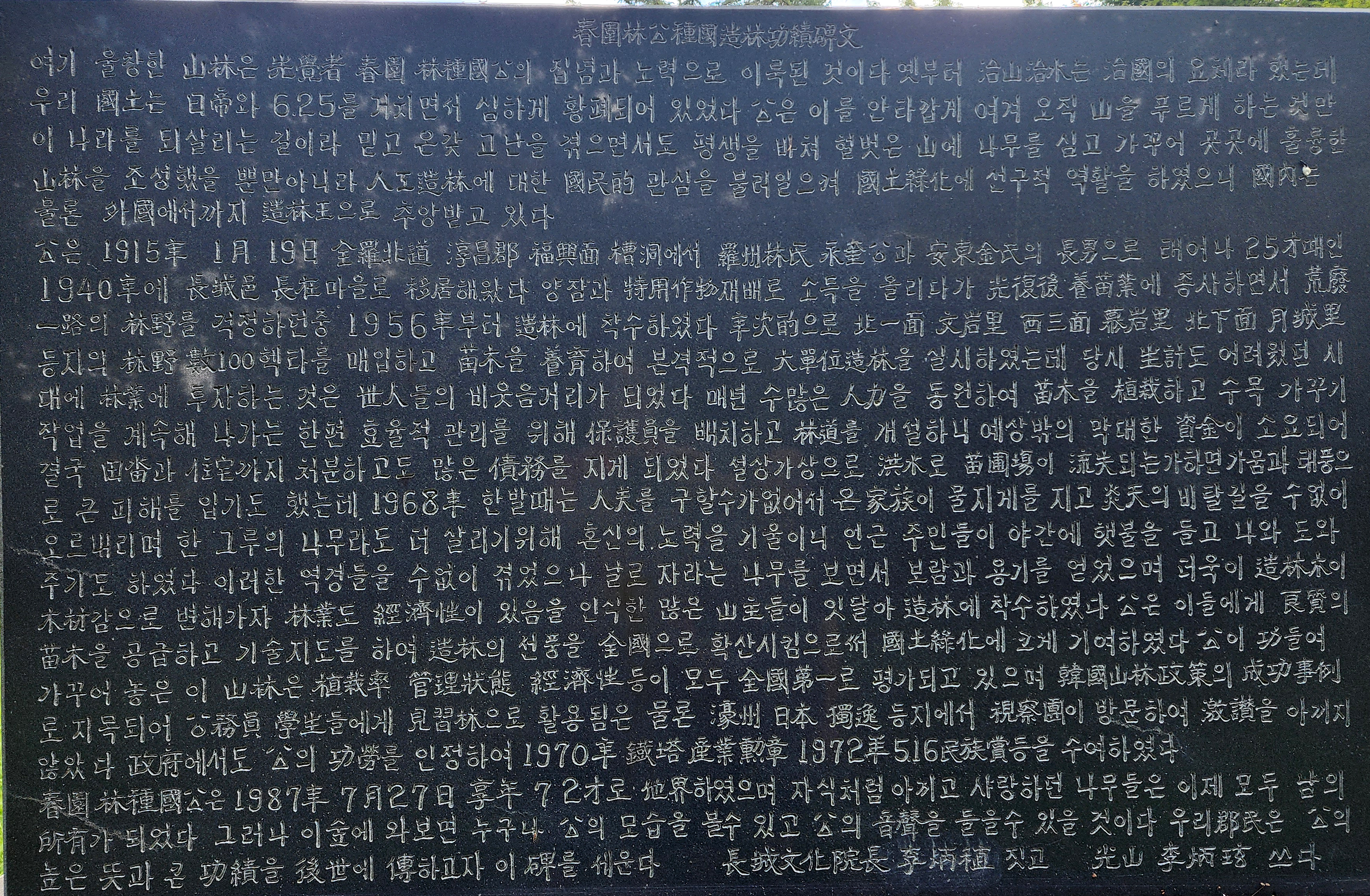 축령산(621m)은 전라남도 장성군 서삼면과 북일면에 걸쳐 있는 산으로 주변 일대가 편백나무숲이라 산림욕 명소로 유명하다. 한국의 조림왕이라고 불리는 춘원 임종국(林種國 1915~1987)이 1956년부터 1987년까지 사재를 털어 숲을 가꾸었다. 축령산 남서쪽 산록에 숲이 조성되어 있으며, 조성면적은 약 2.9㎢에 이른다.
